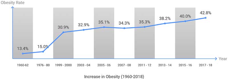 According to the 2017–2018 NHANES report, 30.3% of Americans were overweight, while 42.8% were obese. Among these, 9.6% were severely obese, which means they had a BMI at or above 40.0.
